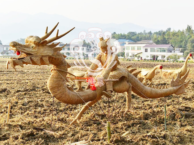 現在的精致稻草人藝術通常是由專業美術老師的造型放樣,然后由焊工師傅焊接出立體造型造型,然后以稻草或者稻草繩為材料編捆制作而成。
