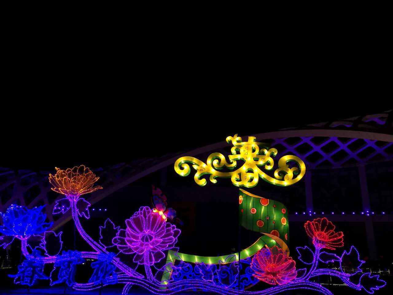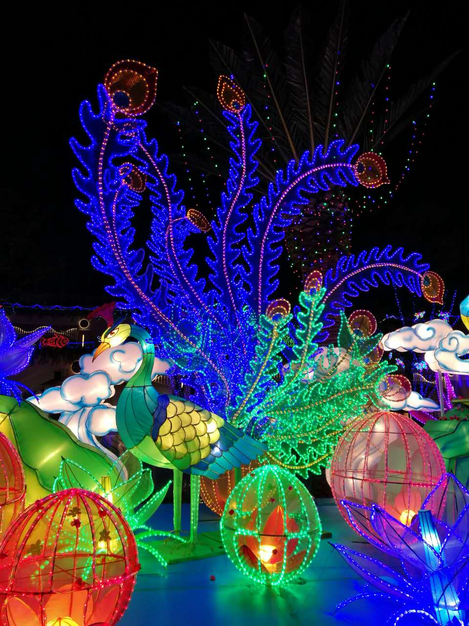 1、“孔雀迎賓”燈組通過孔雀形體的轉動,結合牡丹花的盛開把云南和滇池會展的地域主題發揮的淋漓盡致。