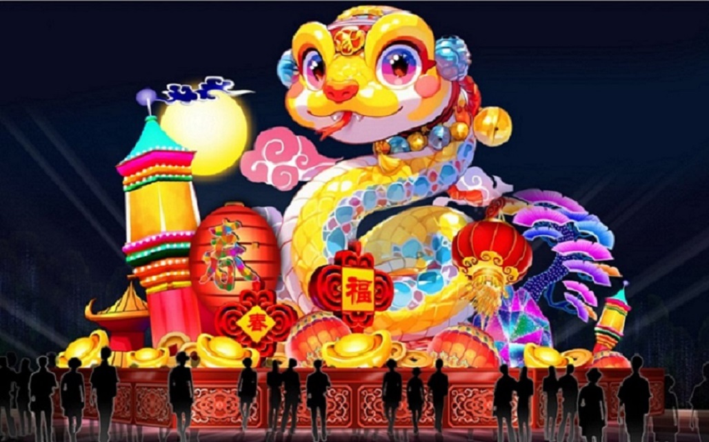 那一盞盞精心制作的新春蛇年花燈會,以其獨特的造型和絢麗的色彩,瞬間抓住了人們的目光。巨大的蛇形彩燈高高聳立,它的身軀蜿蜒曲折,鱗片在燈光的映照下熠熠生輝,仿佛一條靈動的神蛇降臨人間。蛇首高高昂起,眼神中透露出威嚴與神秘,仿佛在守護著這片歡樂的土地。