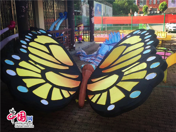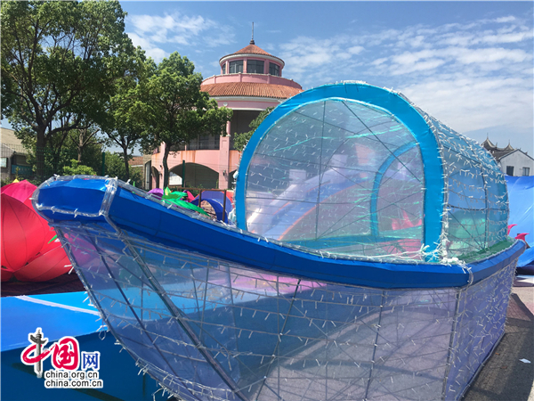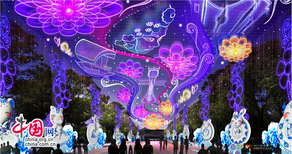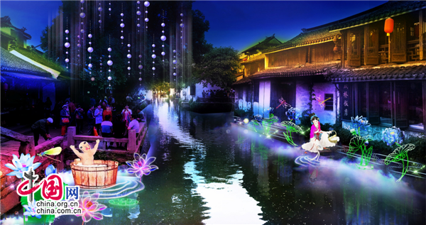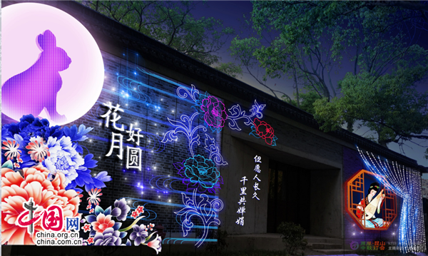 進入“周莊故事”彩燈區(qū)的第一入口,映入記者眼簾的便是富有周莊特色的“八景八俗”,通道兩側(cè)分別為八個筒子燈,上面注明景點和風(fēng)俗的名稱,并配有格律詩。走過通道,移步至古鎮(zhèn)街巷,各色彩燈展現(xiàn)出不同造型和形式,有墻角“長”出的梅花和蓮花、有撫彈琵琶的多情女子、有彎腰浣洗的婦女,或在民居的墻面上,或在縱橫的河道里,或在古色古香的石板路。在不期而遇的每個街口和角落,伴隨“謎之誘惑”的彩燈煥發(fā)出萬種“風(fēng)情”。在“祈福中華”彩燈區(qū),近10米高的大彩球上坐著兩個萌娃,憨態(tài)可掬。后面的大背景是一個16米高的巨幅扇面浮在水面,扇面上的荷花嬌艷欲滴,由扇面衍生出一輪滿月,兩側(cè)的奔月嫦娥在空中飛舞,錯落在水中的并蒂蓮花將點亮水面。